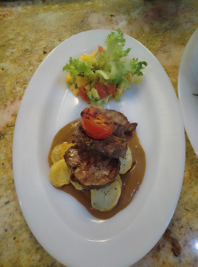 Home / beef mignon,mango and ovacado salad, saute potatoes.